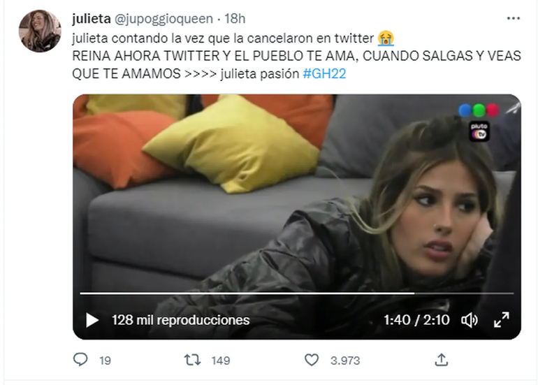 A pesar del mal trago en aquella oportunidad, todo cambió, y hoy en día Julieta es respaldada en las redes: “Julieta contó la vez que la cancelaron en Twitter. Reina ahora Twitter y el pueblo te ama, cuando salgas y veas que te amamos”, comentó una fan page de la hermanita.