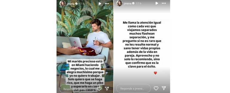 Además, aprovechó para mostrar su molestia frente a las especulaciones que se generan siempre que su novio se va del país sin su compañía: "Me llama la atención igual como cada vez que estamos separados muchos flashean separación, y me pregunto si no es raro que no les resulte normal y sano tener vidas propias además de la vida en pareja. Aprovecho y no solo recomiendo, sino que confirmo que es la clave del éxito".