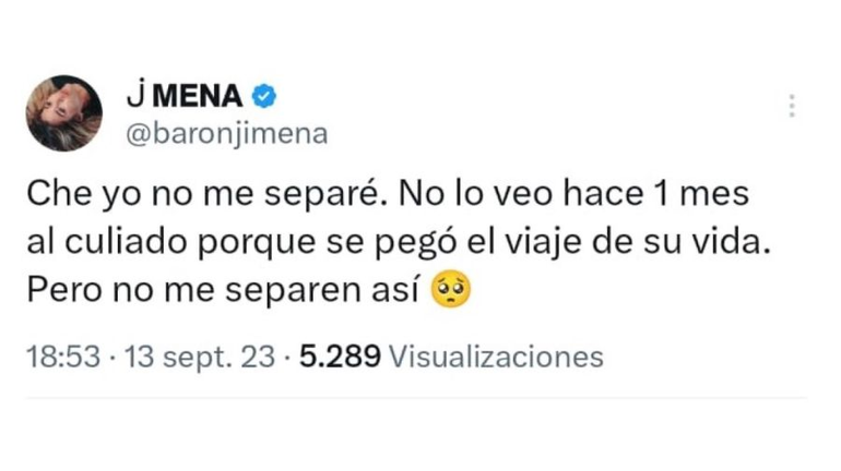 A través de su cuenta de Twitter, la popular cantante expresó: "Che, yo no me separé. No lo veo hace un mes al culiado porque se pegó el viaje de su vida. Pero no me separen así".