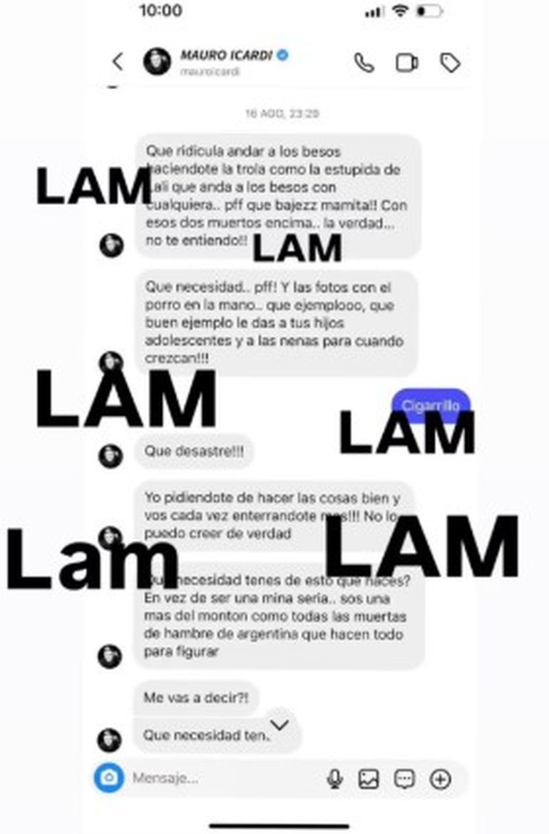 Los mensajes que le habría enviado a la ahora cantante Wanda, se dieron justo después de que diera su show en el Movistar Arena a mediados de agosto. En el mismo hubo besos a distintas personalidades de la música, algo que, al parecer, no le gustó a Icardi: “Qué ridícula andar a los besos haciéndote la trola como la estúpida de Lali que anda a los besos con cualquiera... Puff, ¡qué bajeza mamita! Con esos dos muertos, encima... La verdad, ¡no te entiendo!“.