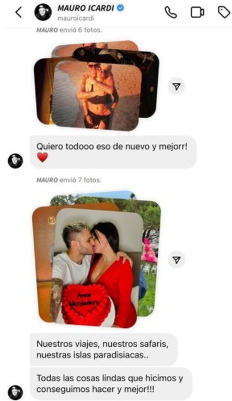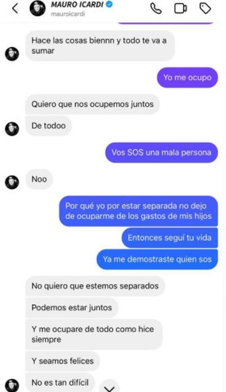 Seguido a este tono que se interpretó como un enojo por parte de ambas partes, él continuó enviando mensajes con el fin de convencerla para la reconciliación y fortalecimiento del vínculo que mantenían hasta entonces. “No quiero que estemos separados. Podemos estar juntos. Y me ocuparé de todo como hice siempre. Y seamos felices. No es tan difícil”, escribió Icardi.