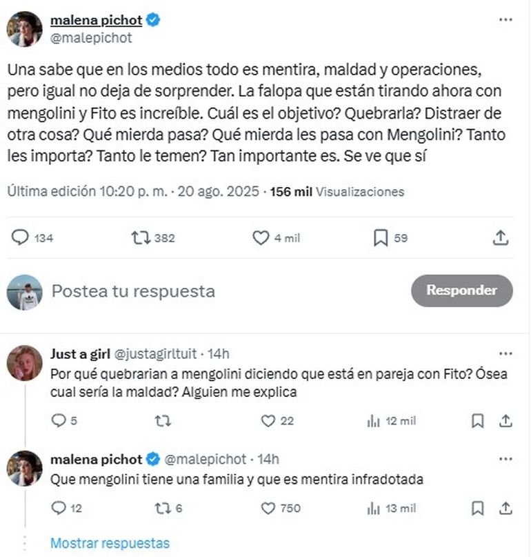 Ante este posteo un usuario de la red social contestó y cuestionó: "¿Por qué quebrarían a Mengolini diciendo que está en pareja con Fito? Ósea cual sería la maldad? Alguien me explica", escribió a lo que Pichot respondió: “Que Mengolini tiene una familia y que es mentira infradotada”.