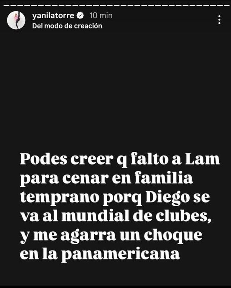 Este viernes se esperaba que Yanina Latorre estuviera presente en LAM, pero su ausencia llamó la atención. A través de sus redes sociales, la panelista aclaró por qué no pudo despedirse “como corresponde” de su esposo, Diego Latorre, antes de su viaje al Mundial de Clubes. Su explicación fue muy humana: salió corriendo del canal para cenar en familia, pero quedó demorada por un choque en la Panamericana justo en el momento clave.