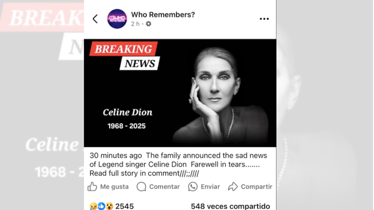 El rumor tomó fuerza cuando un sitio de Facebook llamado “Who Remembers?” publicó una imagen en blanco y negro de la cantante acompañada por los años “1968-2025”, lo que dejaba entrever que la artista canadiense había muerto. Además, en la publicación se leía: “Hace apenas media hora, la familia, entre lágrimas, compartió la triste noticia”.