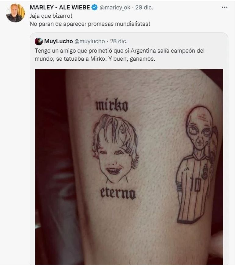 Luego de plasmar la cara del menor de cinco años en su pantorrilla, un amigo del hombre en cuestión subió el resultado final a su cuenta de Twitter y esta se viralizó al instante. "Tengo un amigo que prometió que si Argentina salía campeón del mundo, se tatuaba a Mirko. Y buen, ganamos", escribió el usuario de Twitter @muylucho, junto a una imagen que no tardó en llegarle al conductor de Por el mundo.