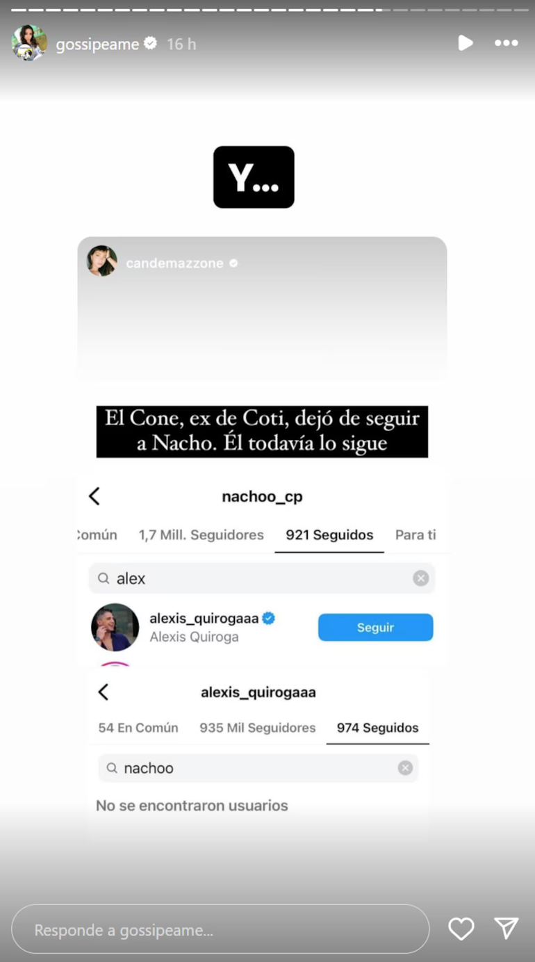 La influencer evidenció que el cordobés dejo de seguir en Instagram a Nacho Castañares -quien todavía lo sigue- por su romance con la influencer correntina.