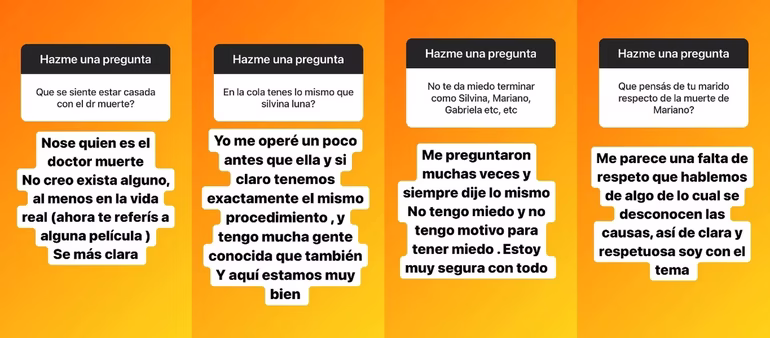 Entre las preguntas que la mujer decidió publicar, hubo referencias directas al caso de Silvina Luna, Pamela Sosa y Mariano Caprarola, el panelista de la Jaula de la Moda y ex paciente del médico. Uno de los internautas mencionó al ex productor y ella contestó “Me parece una falta de respeto que hablemos de algo de lo cual se desconocen las causas, así de clara y respetuosa soy sobre el tema”, recalcó.