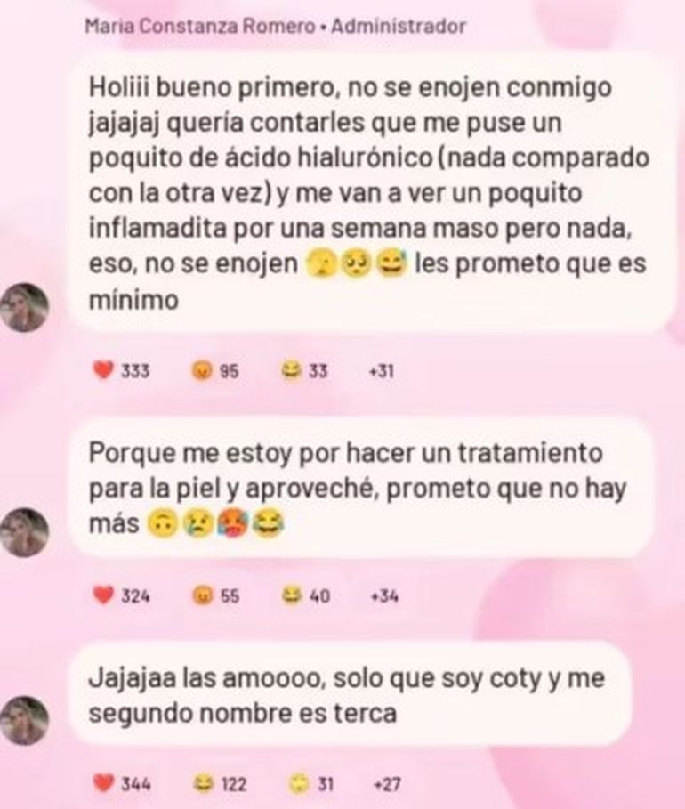Luego, en continuación con su relato, explicó: “Quiero contarles que me puse un poquito de ácido hialurónico, nada comparado con la otra vez, y me van a ver un poquito inflamadita por una semana más o menos, pero nada... Eso... No se enojen, les prometo que es mínimo”.