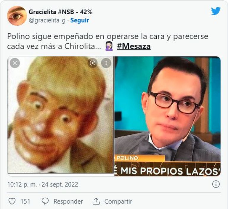 Sucede que el rostro de Polino, pasado de maquillaje y con algún que otro toque, según comentaron muchos usuarios en redes, en el programa de La Chiqui hizo que estallaran los memes y los chistes.