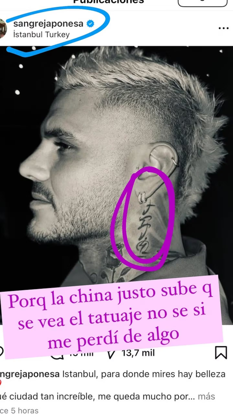 La relación de Icardi y la China crece a pasos agigantados. Ahora, el delantero del Galatasaray se hizo un nuevo tatuaje en japonés, de donde La China plantó sus orígenes (de hecho su cuenta en Instagram es sangrejaponesa). La panelista Juariu tomó nota enseguida: la frase en letras orientales del lado izquierdo del cuello de Icardi sería “Padayon”, que traducida al español significa “perseverar” o “salir adelante”.
