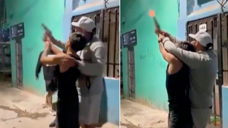 En las imágenes que se viralizaron en las redes sociales se ve como junto a un vecino que aparentemente lo ayuda a tomar el arma, dispara al aire tres veces.