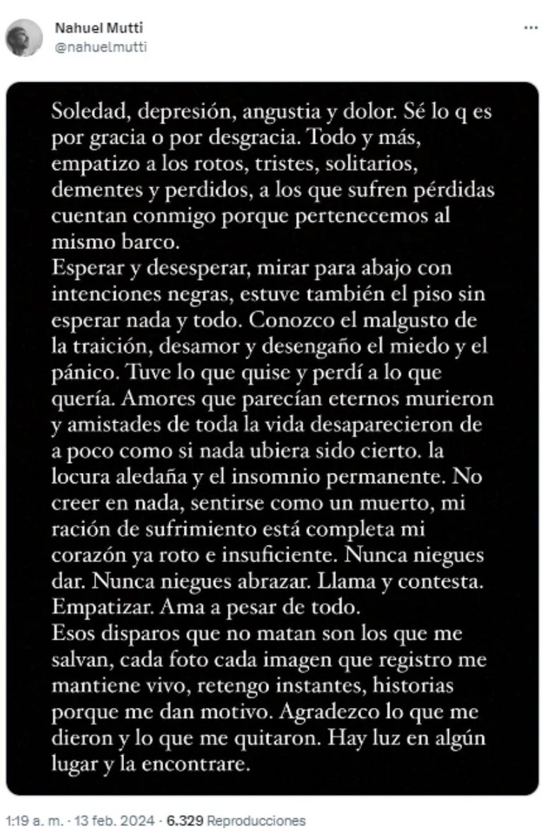 Hace poco más de un mes, Nahuel Mutti preocupó a todos con un mensaje en donde expresó su profunda soledad y dolor, atribuyéndolo a su separación de Catarina Spinetta, con quien compartió más de dos décadas de su vida y tres hijos.