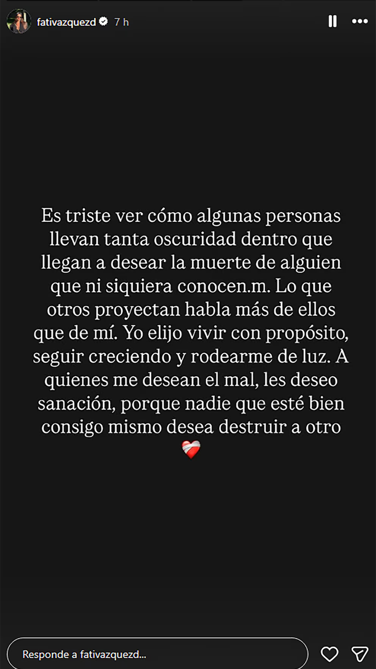 Ante la gravedad de esta situación, Fati decidió romper el silencio en sus redes sociales para denunciar la violencia de los mensajes que recibió: "Es triste ver personas que tienen tanta oscuridad dentro que desean la muerte de alguien que ni siquiera conocen. Lo que otros proyectan, habla más de ellos que de mí. Elijo vivir con el propósito de seguir creciendo y rodeándome de luz. A quienes me desean el mal, les deseo la curación, porque nadie que esté bien consigo mismo desea la destrucción de otro".