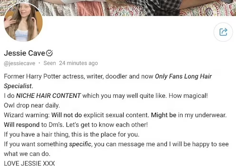 Jessie Cave anunció en marzo de 2025 la apertura de su cuenta en OnlyFans, donde ofrece videos y sonidos relacionados con su cabello, como cepillados y movimientos sensuales de su melena. En su podcast Before We Break Up Again, la estrella de Harry Potter reiteró que su contenido no es sexual, aunque reconoce que puede atraer a personas con intereses o fetiches capilares.