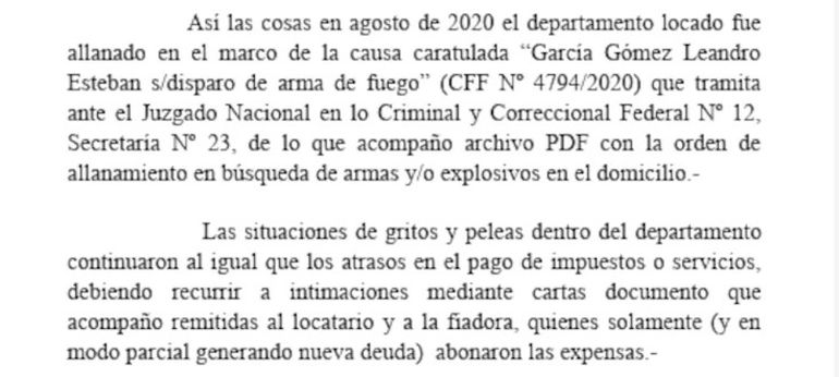 También en 2022, recibió una demanda por el cobro de una suma de $1,3 millones en el contexto del alquiler de un departamento amueblado en el barrio de Colegiales, Capital Federal. Sin embargo, en medio del aspecto económico, en la demanda se detallaron hechos de violencia: “En los primeros meses de 2020 comenzaron a ocurrir sucesos de violencia dentro del departamento locado, tales como gritos de peleas, golpes y ruidos de puertas golpeándose constantemente, que motivaron quejas”.