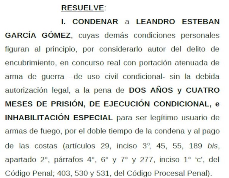 El 23 de diciembre de 2023, el Tribunal N°8 lo condenó a dos años y cuatro meses de ejecución condicional por la causa del disparo. En la causa, García Gómez “reconoció que se encontraba inserto en un contexto de consumo problemático de estupefacientes -cocaína- y ansiolíticos sin prescripción médica”