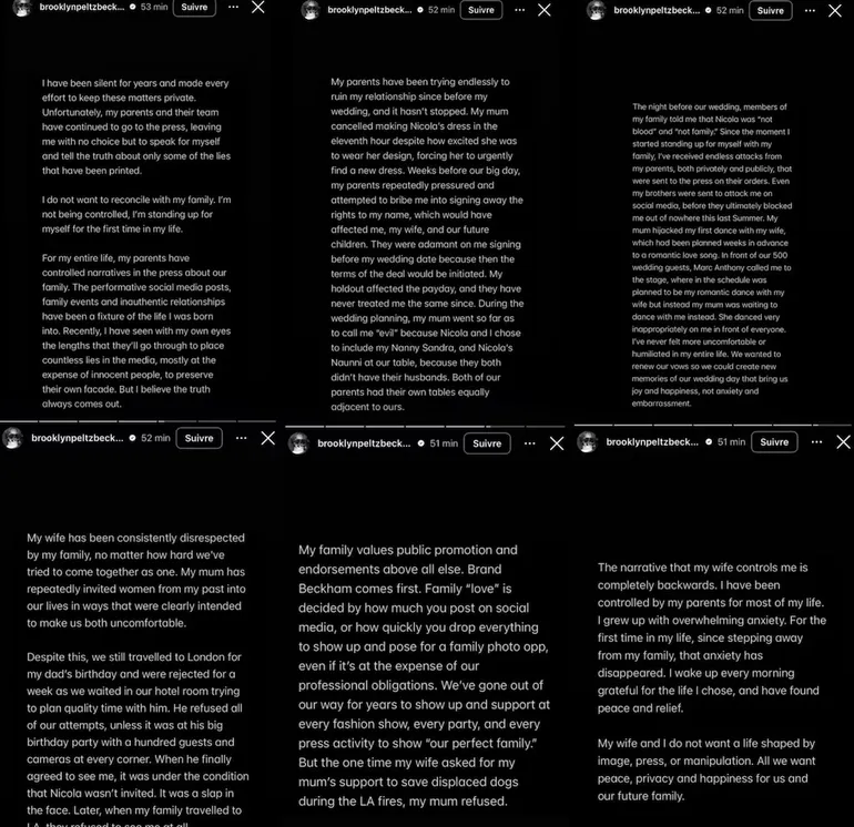 La decisión de Brooklyn de exponer esas acusaciones se produjo después de meses de especulación, bloqueos en redes sociales y ausencias notorias de los Peltz Beckham en eventos o vacaciones familiares promovidas por los Beckham. En su mensaje, Brooklyn aseguró que para sus padres “la marca Beckham va primero. El ‘amor familiar’ depende de cuánto publiques en redes sociales o de qué tan rápido dejes todo para aparecer en una foto familiar”.