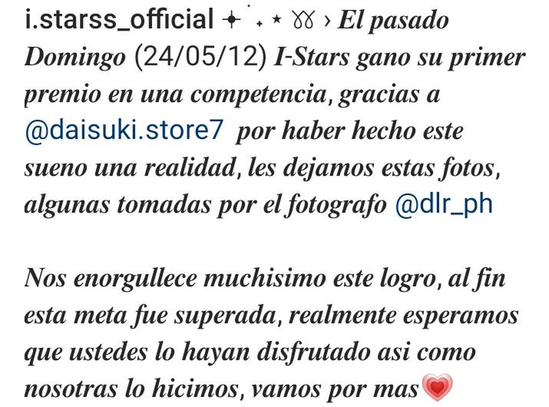 “La sensación de volver a pisar un escenario no se compara con absolutamente nada; la emoción, el miedo, la adrenalina... Si bien la coreografía no salió perfecta, puedo afirmar de forma segura que lo dejamos todo. No recuerdo mucho mis pensamientos mientras bailaba, pero recuerdo la emoción del público, sus gritos, sus aplausos y sobre todo, el orgullo que sentí ese día. Realmente no me importa si no ganamos, ninguna cosa puede recrear ese sentimiento de orgullo que sentí al levantar el logo del grupo, que es más que un grupo de dance cover, es un grupo de amigas, es un grupo de sueños. Es por eso que decidí incluir los sentimientos de cada una hacia el grupo, porque no soy solo yo, el grupo somos todas, las que estamos y las que ya no, y todos aquellos que decidieron creer en nosotras”, culminó Azumi en su brillante exposición. La rompe con el baile y también en la comunicación…