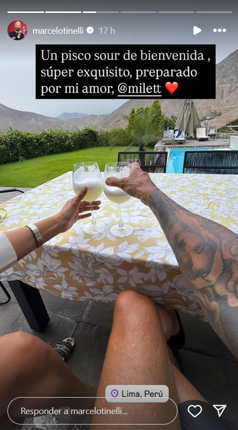 En la imagen, ambos se muestran relajados, con ella recibiéndolo con un trago característico de Perú. "Un psico sour de bienvenida. Súper exiquisito, preparado por mi amor", se expresó el 'Cabezón'. Y, además, sumó en otra historia: "Ceviche increíble y psico sour alucinante. ¿Qué más?", escribió Tinelli en la historia.