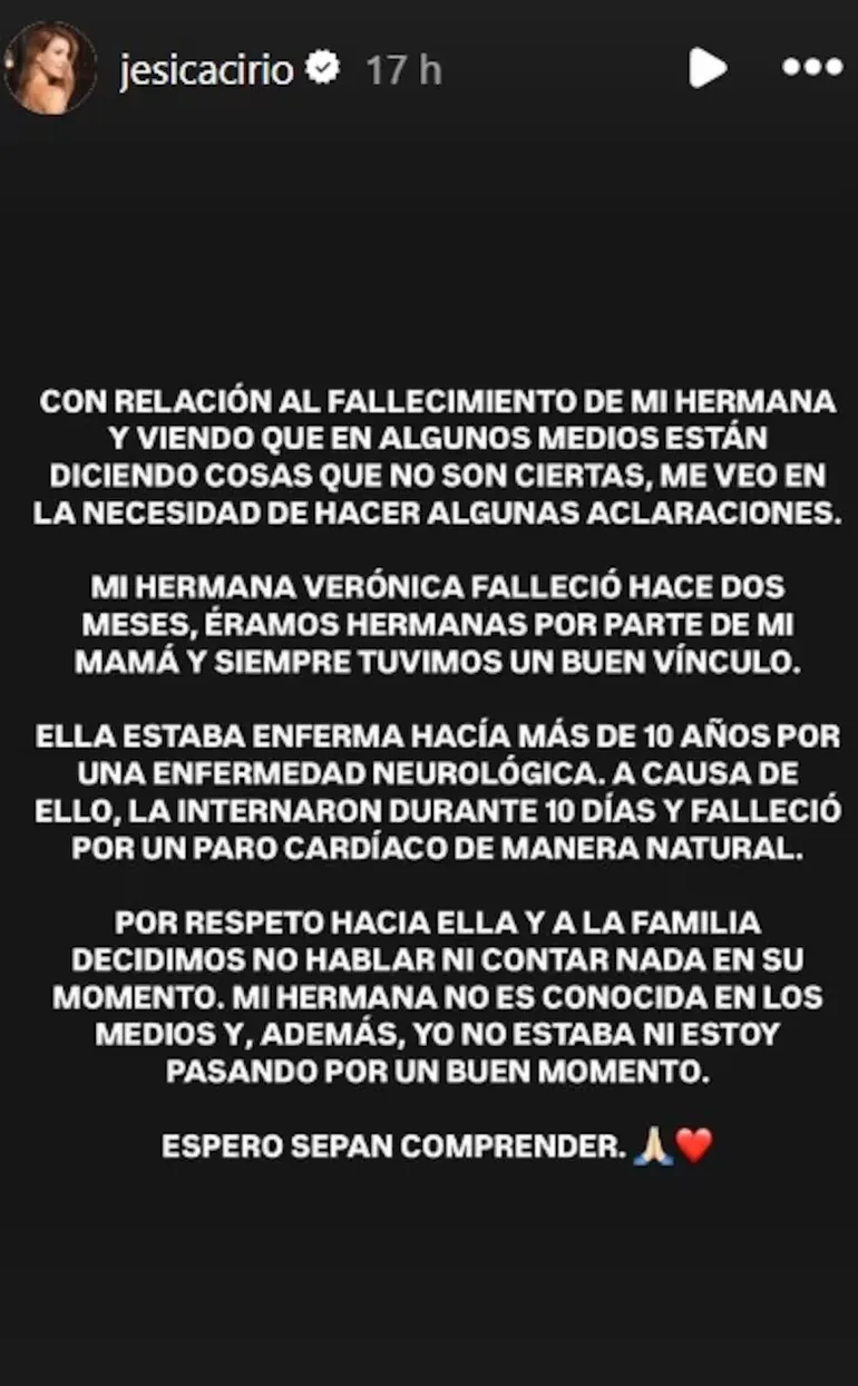 “Con relación al fallecimiento de mi hermana y viendo que en algunos medios están diciendo cosas que no son ciertas, me veo en la necesidad de hacer algunas aclaraciones. Mi hermana Verónica falleció hace dos meses. Éramos hermanas por parte de mi mamá y siempre tuvimos un buen vínculo”, sostuvo en Instagram.