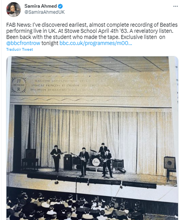 La BBC reveló una grabación en audio de un show de Los Beatles que se realizó hace exactamente 60 años en el internado para varones Stowe, en el condado de Buckinghamshire. La actuación tuvo lugar en un momento en el que la banda se encontraba en pleno ascenso, y hacía apenas dos semanas que habían grabado su primer disco de estudio, "Please Please Me".