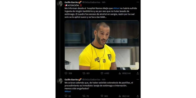 “Me informan desde el hospital Ramos Mejía que Maxi no habría sufrido ingesta de ningún barbitúrico y es por eso que no hubo lavado de estómago. El cuadro fue por exceso de alcohol en sangre, razón por la cual solo se le aplicó suero y se fue a las 9AM”, escribió en su cuenta de Twitter el panelista de A la tarde.
