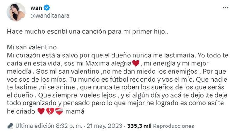 “Hace mucho escribí una canción para mi primer hijo”, escribió en su cuenta de twitter Wanda Nara, antes de compartir la letra de la canción que hizo en honor a su primogénito, que tituló San Valentino (en un curioso juego con el nombre de su hijo).
