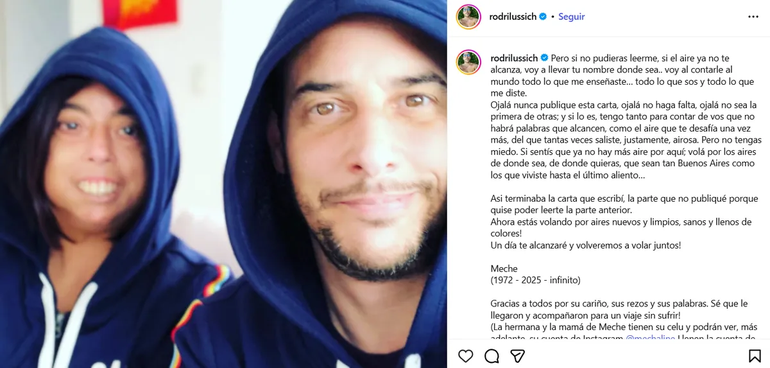 "Gracias a todos por su cariño, sus rezos y sus palabras. Sé que le llegaron y acompañaron para un viaje sin sufrir! (La hermana y la mamá de Meche tienen su celu y podrán ver, más adelante, su cuenta de Instagram @mechaline Llenen la cuenta de mensajes que ellas las van a leer)", cerró.