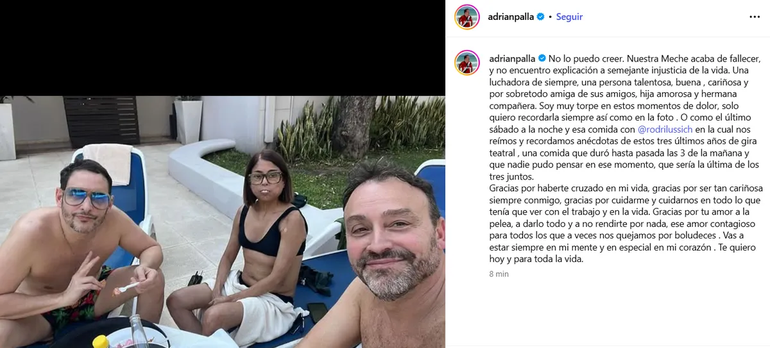 "No lo puedo creer. Nuestra Meche acaba de fallecer, y no encuentro explicación a semejante injusticia de la vida. Una luchadora de siempre, una persona talentosa, buena , cariñosa y por sobretodo amiga de sus amigos, hija amorosa y hermana compañera. Soy muy torpe en estos momentos de dolor, solo quiero recordarla siempre así como en la foto. O como el último sábado a la noche y esa comida con @rodrilussich en la cual nos reímos y recordamos anécdotas de estos tres últimos años de gira teatral, una comida que duró hasta pasada las 3 de la mañana y que nadie pudo pensar en ese momento, que sería la última de los tres juntos", escribió Pallares en un posteo de Instagram.