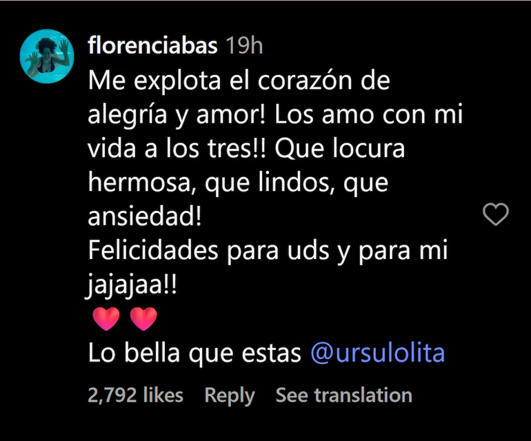Florencia, que también será abuela por primera vez, compartió su emoción con un mensaje sentido en redes: “Me explota el corazón de alegría y amor”, publicó, dejando claro el nivel de felicidad que atraviesa a la familia. El mensaje fue más allá y se extendió a la pareja: “¡Los amo con mi vida a los tres! Qué locura hermosa, qué lindos, qué ansiedad. Felicidades para ustedes y para mí”. No faltó tampoco un guiño especial a la futura mamá: “Lo bella que estás”.
