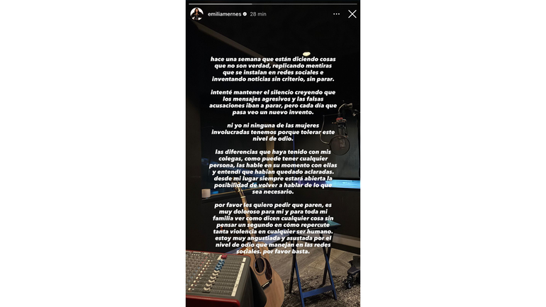 A través de su cuenta oficial de Instagram (@emiliamernes), donde reúne millones de seguidores, la artista aseguró que en los últimos días se difundieron versiones que no son ciertas. “Hace una semana que están diciendo cosas que no son verdad, replicando mentiras e inventando noticias sin criterio”, escribió.