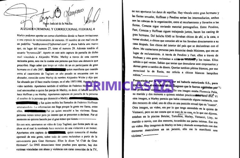 El expediente revela los nombres de varias figuras del espectáculo mencionadas en la denuncia por trata de personas y abuso de menores. La causa sigue en etapa de instrucción.