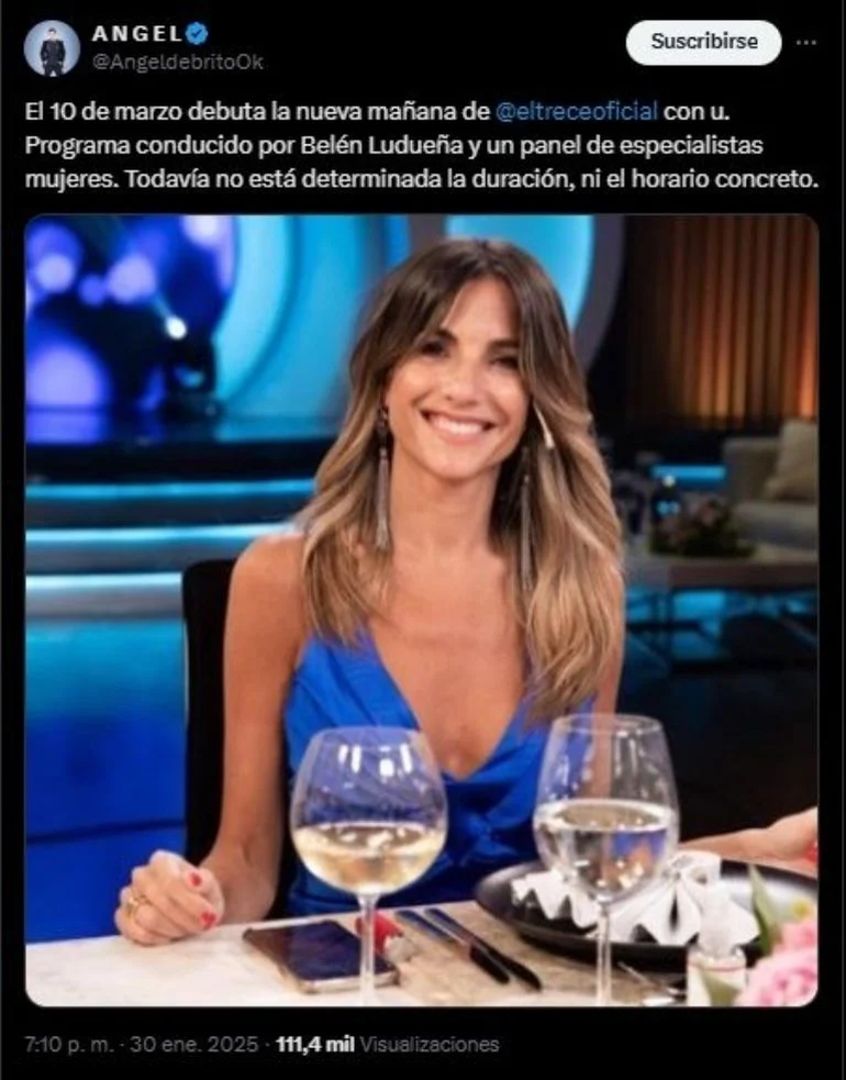 A Través de su cuenta de X, De Brito reveló la fecha de estreno del nuevo ciclo periodístico que conducirá María Belén Ludueña, allí expuso: "El 10 de marzo debuta la nueva mañana de El Trece con un programa conducido por Belén Ludueña y un panel de especialistas mujeres".