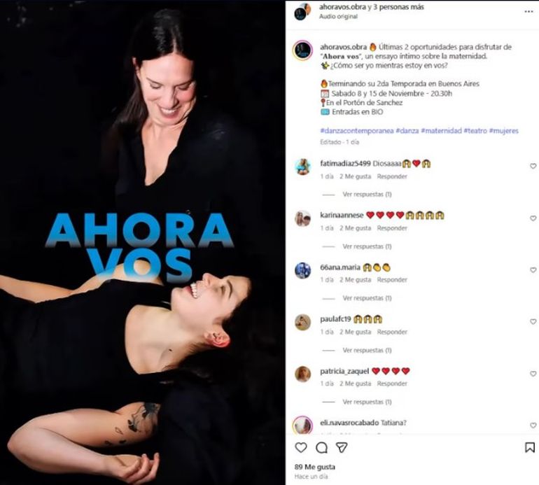 “¿Cómo ser yo mientras estoy en vos? Estamos terminando su segunda temporada en Buenos Aires. Sábado 8 y 15 de noviembre a las 20:30 en el Portón de Sánchez", escribió en su cuenta junto a un flyer promocionando su proyecto titulado "Ahora Vos", un ensayo íntimo sobre la maternidad.
