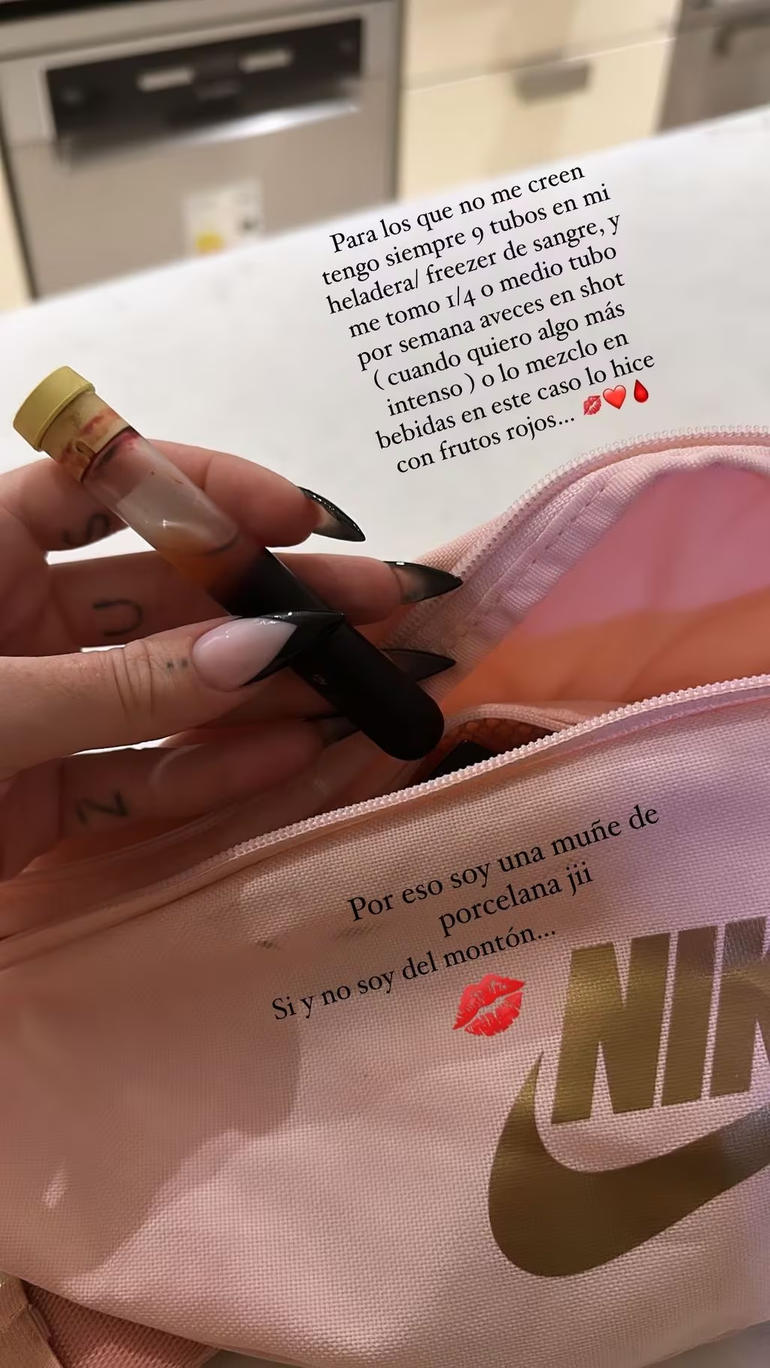 Sus palabras llamaron poderosamente la atención de propios y extraños. La controversial modelo compartió otra imagen sosteniendo un tubo de sangre, explicando: “Para los que no me creen, tengo siempre nueve tubos en mi heladera/freezer de sangre y me tomo 1/4 o medio tubo por semana, a veces en shot, cuando quiero algo más intenso o lo mezclo con bebidas, en este caso son frutos rojos”.