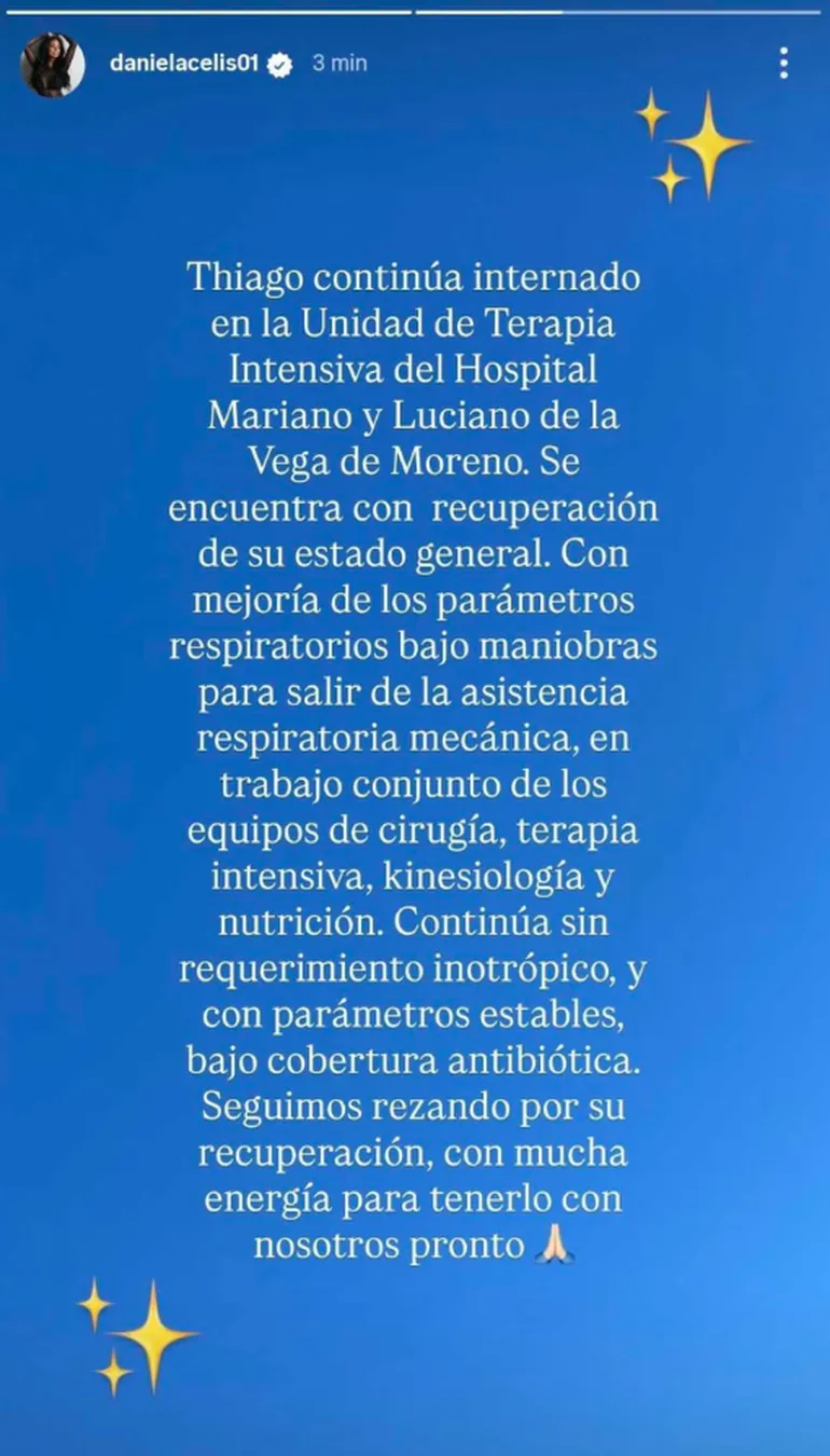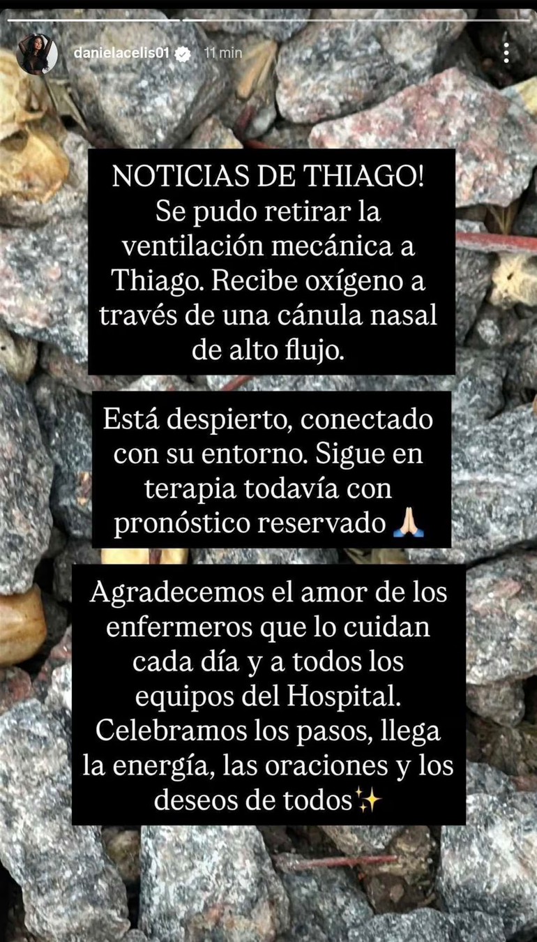 Este lunes, Daniela Celis también compartió en sus redes sociales noticias acerca de la evolución de la salud del papá de sus gemelas, Thiago Medina. A través de una historia de Instagram, la influencer explicó que los médicos decidieron sacarle la ventilación mecánica al ex Gran Hermano luego del fuerte accidente que sufrió con su moto el pasado 12 de septiembre en Moreno.