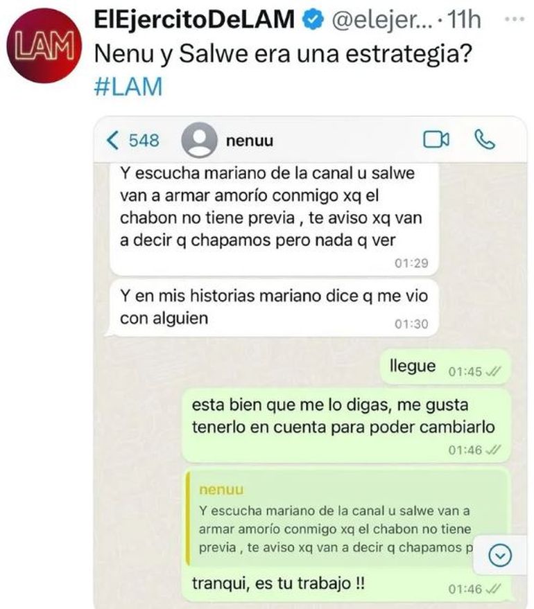 A través de la cuenta de X de LAM, compartieron una supuesta captura de pantalla de una conversación por WhatsApp con Nenu. Allí, se puede ver que la bailarina primero indica: "Y escuchá, Mariano De La Canal o Salwe van a armar amorío conmigo porque el chabón no tiene previa".