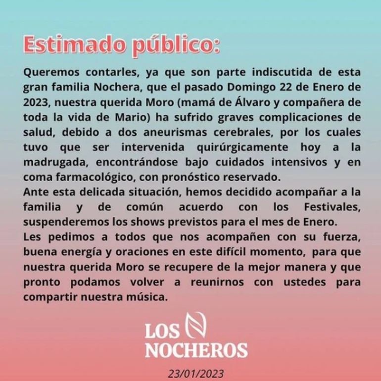 “Queremos contarles, ya que son parte indiscutida de esta gran familia Nochera, que el pasado domingo 22 de enero de 2023, nuestra querida Moro (mamá de Álvaro y compañera de toda la vida de Mario) ha sufrido graves complicaciones de salud, debido a dos aneurismas cerebrales, por los cuales tuvo que ser intervenida quirúrgicamente hoy a la madrugada, encontrándose bajo cuidados intensivos y en coma farmacológico, con pronóstico reservado”, aseguraron en la red social a sus miles de fanáticos.