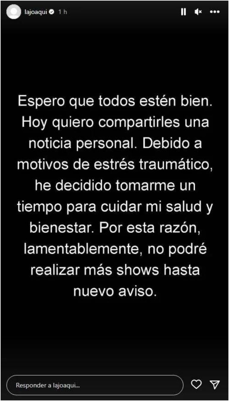 “Espero que todos estén bien. Hoy quiero compartirles una noticia personal. Debido a motivos de estrés traumático, he decidido tomarme un tiempo para cuidar mi salud y mi bienestar. Por esta razón, lamentablemente, no podré realizar más shows hasta nuevo aviso”, escribió la artista.