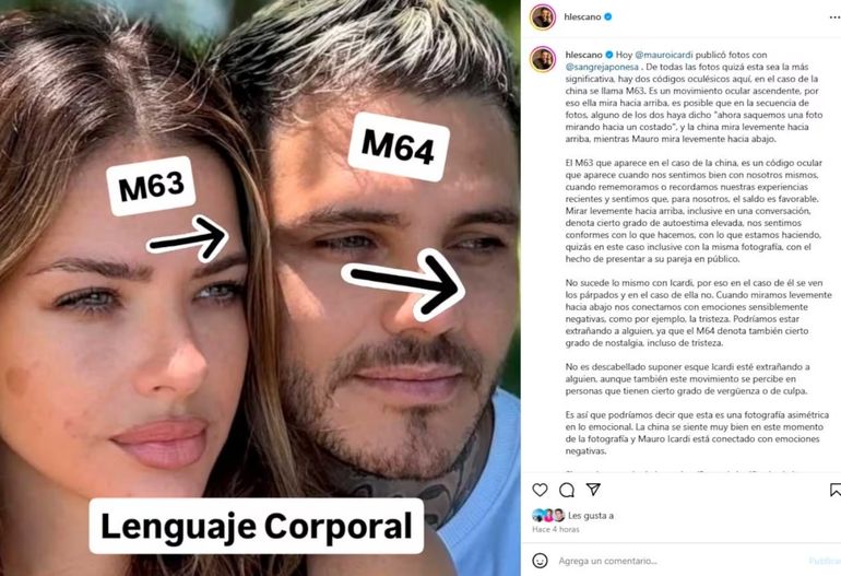 Para Lescano, el análisis de la imagen deja en evidencia una desconexión emocional entre ambos. “Es así que podríamos decir que esta es una fotografía asimétrica en lo emocional. La China se siente muy bien en este momento de la fotografía y Mauro Icardi está conectado con emociones negativas”, concluyó.