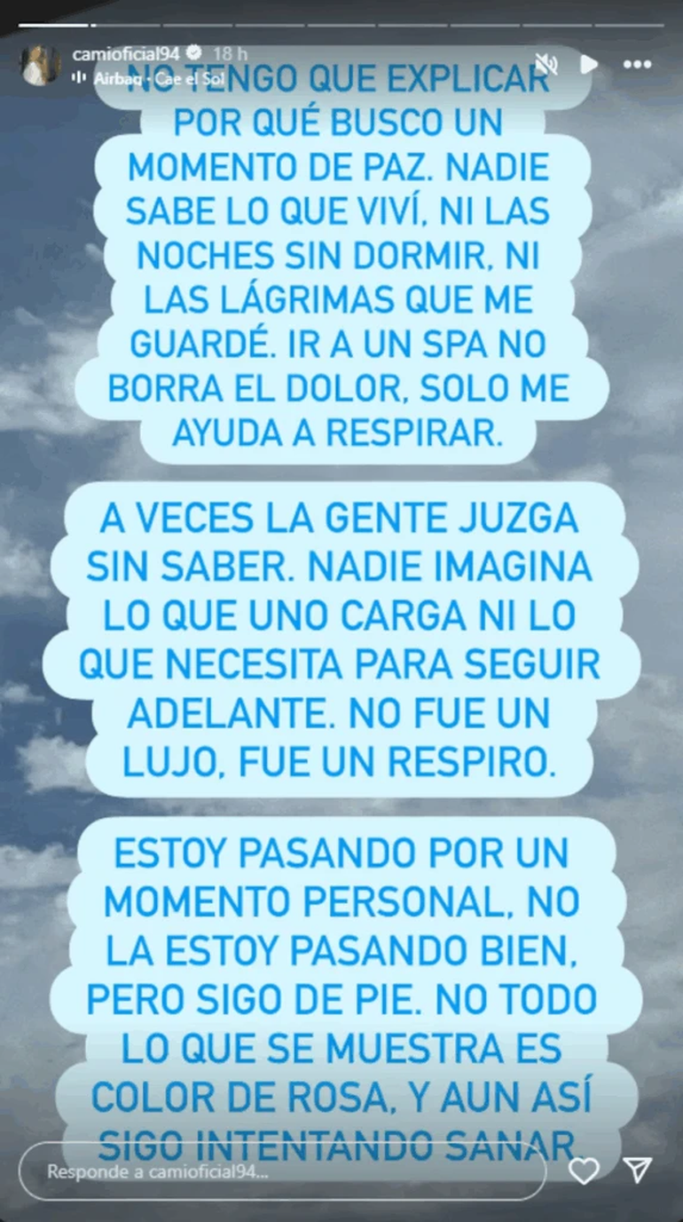En su cuenta personal, publicó luego un texto que muchos interpretaron como una respuesta a las críticas: “A veces la gente habla sin saber el dolor ni las luchas que uno vivió. No necesito justificarme, porque mi conciencia está tranquila. No tengo que explicar por qué busco un momento de paz. Ir a un spa no borra el dolor, solo me ayuda a respirar”.