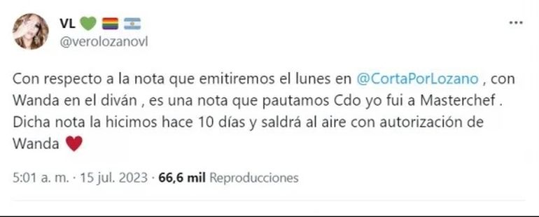 “Con respecto a la nota que emitiremos el lunes en Cortá por Lozano, con Wanda en el diván, es una nota que pautamos cuando yo fui a Masterchef”, comentó la conductora respecto a lo que será el material exclusivo que saldrá al aire.
