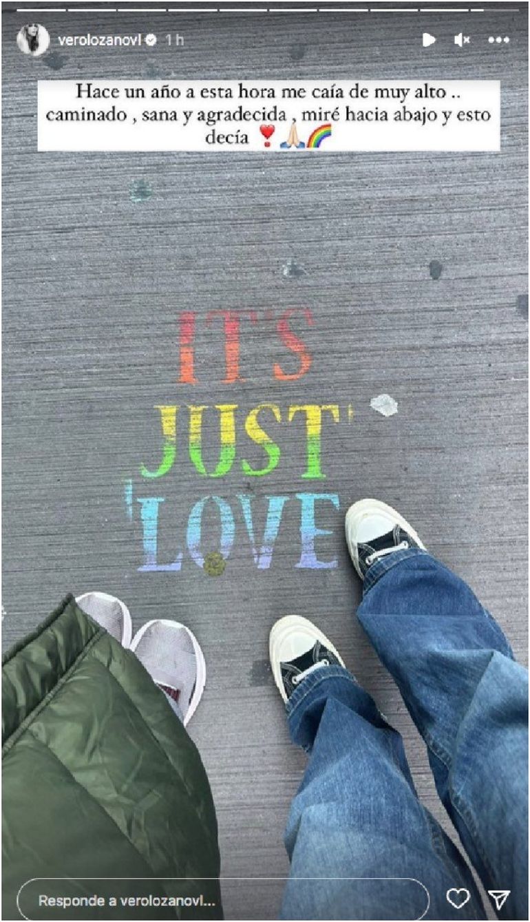Hace unos meses, la conductora había compartido una foto en el día del aniversario de su caída. "Hace un año a esta hora me caía de muy alto... caminando, sana y agradecida, miré hacia abajo y esto decía", escribió Vero Lozano junto a una imagen donde se puede ver un piso con la inscripción, en inglés, de la frase: "Es sólo amor".