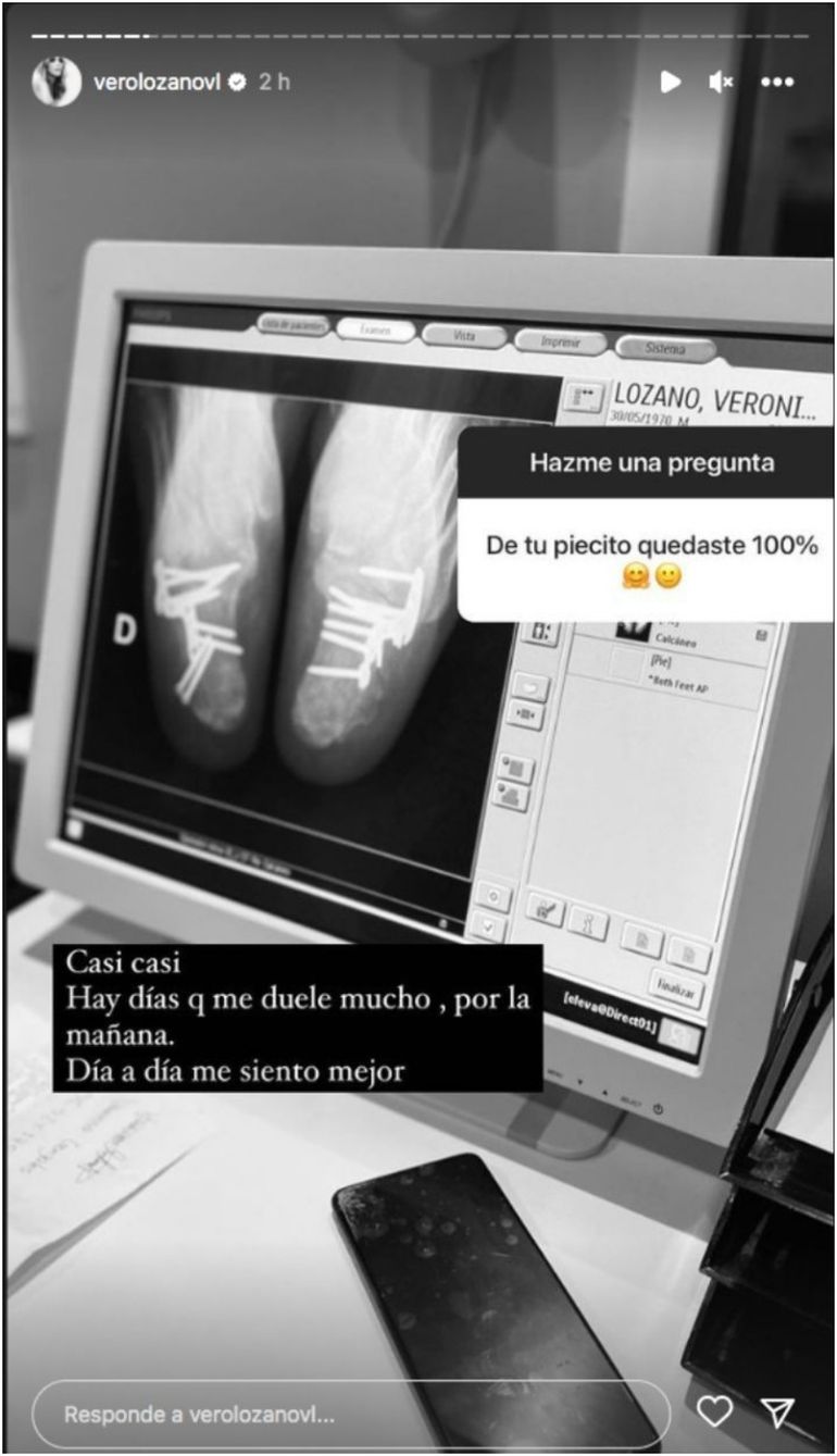 "Casi casi. Hay días que me duele mucho, por la mañana", admitió Vero Lozano junto la imagen de sus pies, luego agregó positiva: "Día a día me siento mejor".