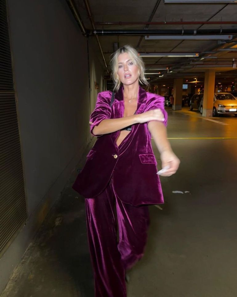 El detalle distintivo lo aportaba el palazzo en terciopelo color aubergine que hace match con su blazer terciopelado a tono, que agregaba un toque de extravagancia y elegancia a la vez. Mery Del Cerro demostró una vez más su sentido impecable de la moda al crear un conjunto que combinaba audacia y glamour con maestría, dejando en claro por qué es considerada una de las referentes del estilo en Argentina.