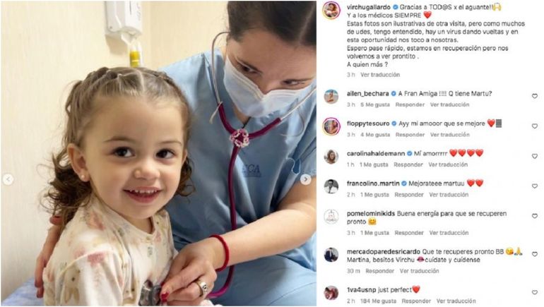 En la imagen se la puede ver a la pequeña Martina sonriendo mientras es atendida por una médica. "Estas fotos son ilustrativas de otra visita, pero como muchos de ustedes, tengo entendido, hay un virus dando vueltas y en esta oportunidad nos tocó a nosotras", explicó Virginia Gallardo.