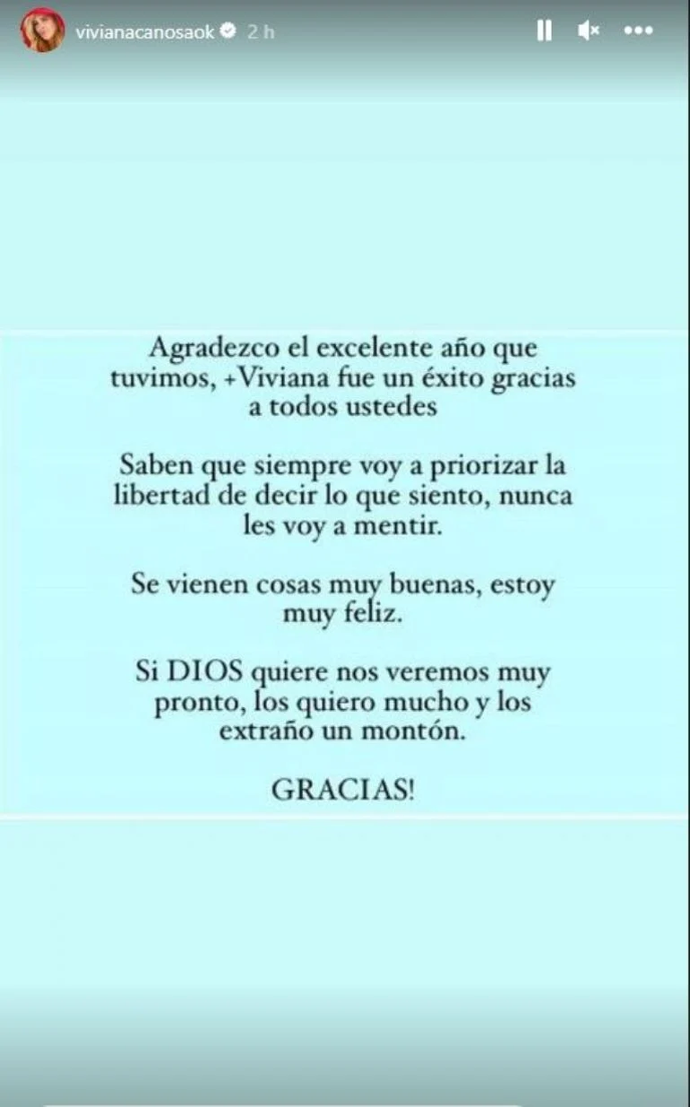 Además, la periodista continuó: “Agradezco el excelente año que tuvimos, +Viviana fue un éxito gracias a todos ustedes”, remarcó y luego aclaró: “Saben que siempre voy a priorizar la libertad de decir lo que siento, nunca les voy a mentir”.