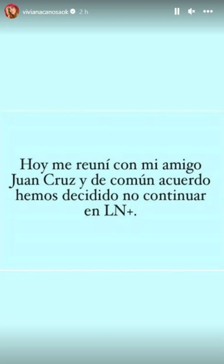 En primer lugar, Viviana confirmó dejando en claro que ya no será parte del programa en el que estuvo durante un tiempo, y haciendo referencia a que tuvo contacto directo con el director de programación del canal, Juan Cruz Ávila, que: “Hoy me reuní con mi amigo Juan Cruz y de común acuerdo hemos decidido no continuar en LN+”,