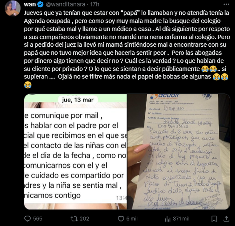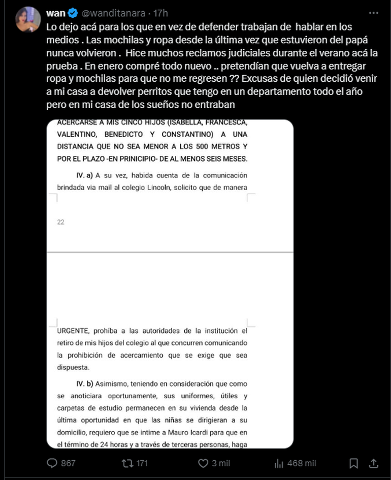 A través de la plataforma X, antes llamada Twitter, Wanda Nara, publicó documentos, papeles y cuestionó los dichos de la representante legal del futbolista, Mauro Icardi, del Galatasaray. “Lo dejo acá para los que en vez de defender trabajan de hablar en los medios. Las mochilas y ropa desde la última vez que estuvieron del papá nunca volvieron”, escribió Nara.