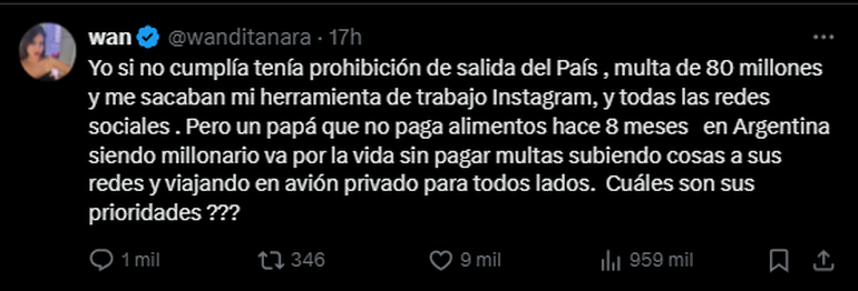 “Por mis hijas doy mi vida y nunca voy a tener la agenda ocupada, porque son mi prioridad y por qué hace 8 meses mantengo sola y parece que así seguiré por qué la justicia prioriza que el papá gaste en ‘Gatos’ y no en sus perritos e hijas”, lanzó Wanda en su cuenta de X (ex Twitter).